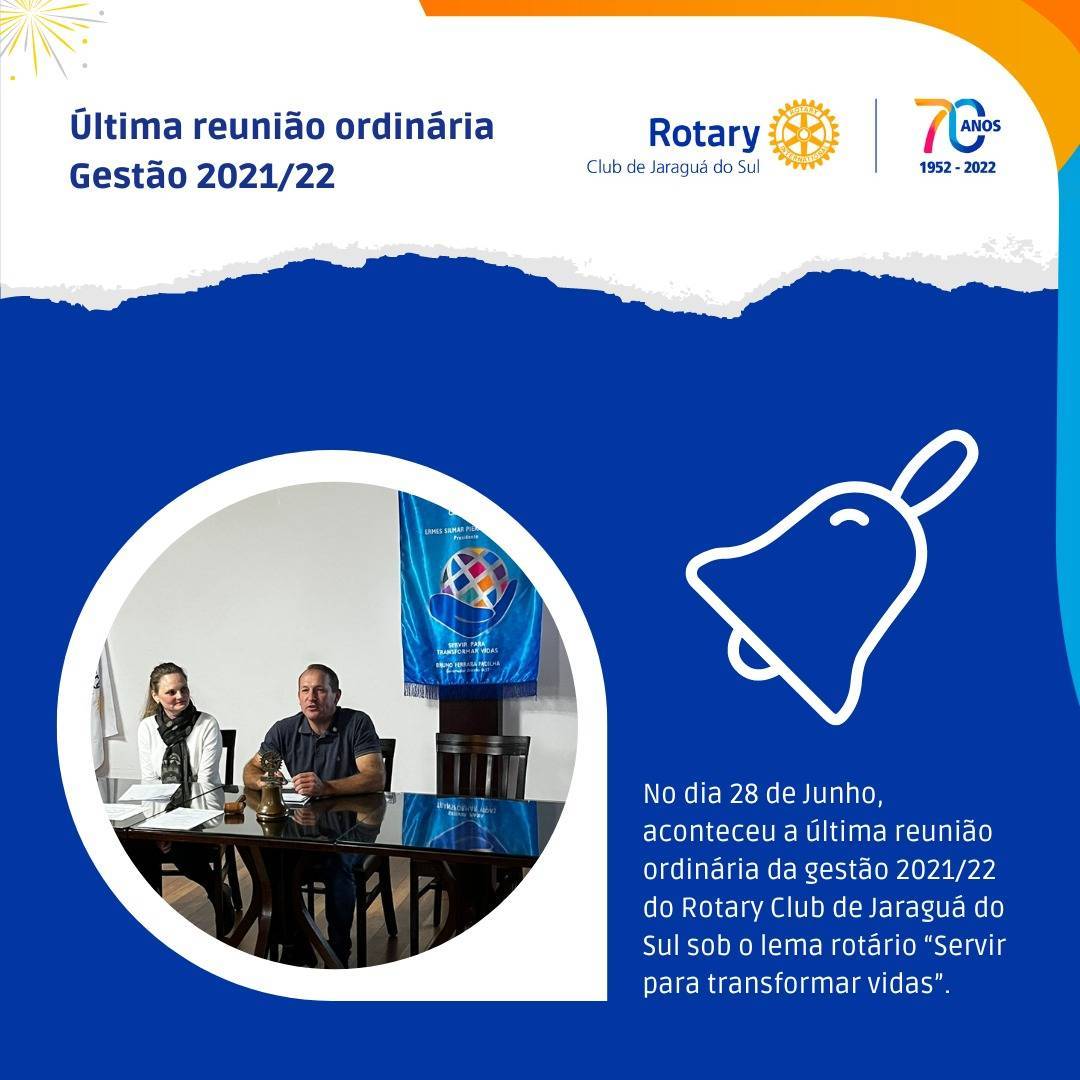 Na terça-feira (28 de junho), aconteceu a última reunião ordinária da gestão 2021/22 do Rotary Club de Jaraguá do Sul sob o lema rotário “Servir para transformar vidas”.