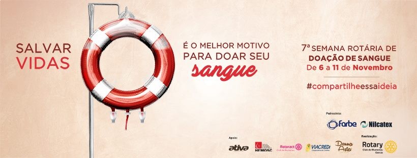 Com o slogan “Salvar vidas é o melhor motivo para doar seu sangue”, o Rotary Club de Blumenau – Garcia promove a sétima edição da campanha de incentivo à doação de sangue, objetivando reforçar os estoques no Hemosc de Blumenau. Ela começa na próxima segunda-feira, dia 06, se prolongando até dia 11.